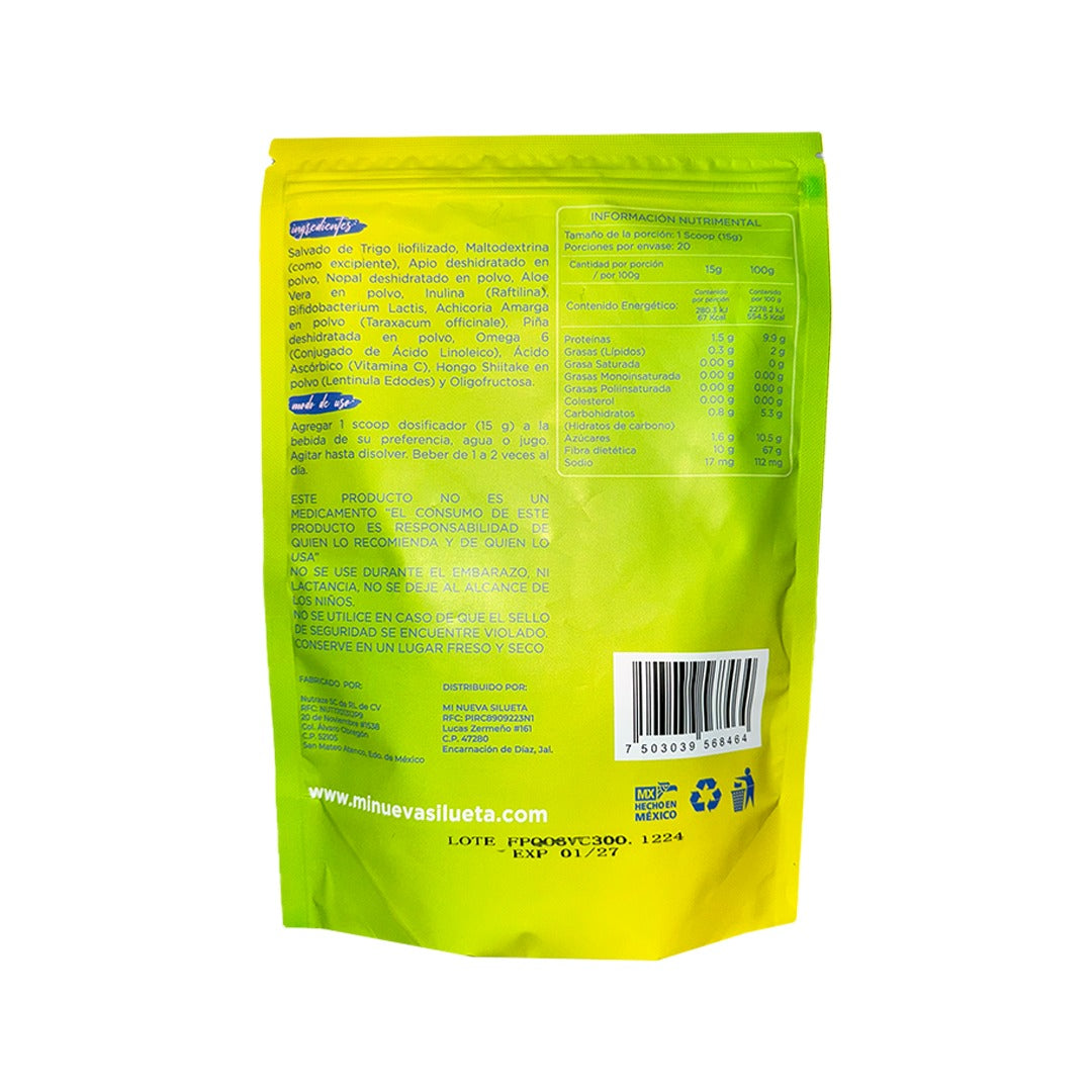 Ingredientes: salvado de trigo, apio deshidratado, nopal deshidratado, inulina, bifidobacterium lactis, piña deshidratada, Omega 6 y ácido ascórbico.