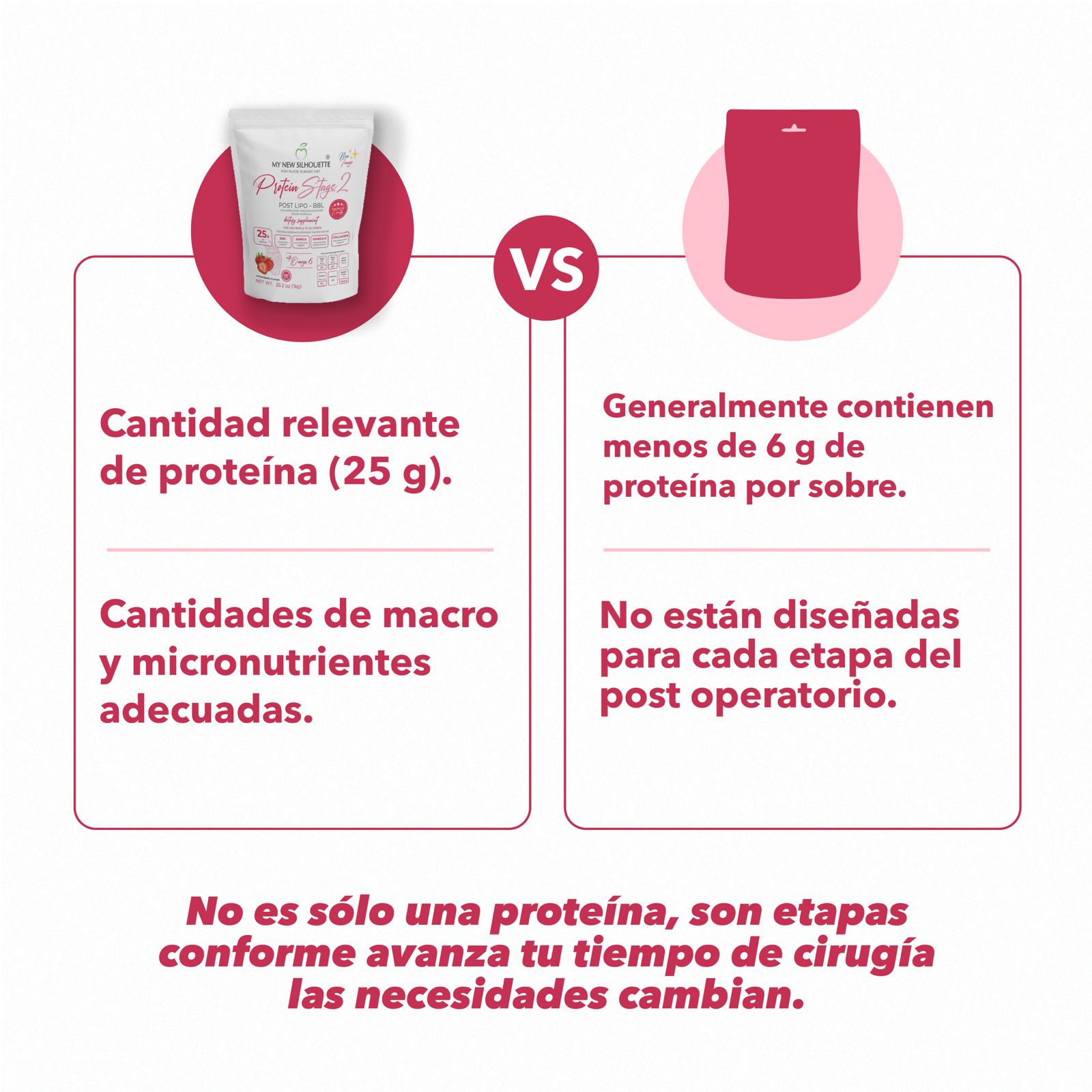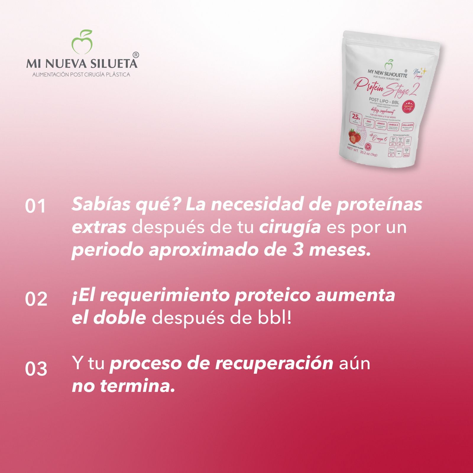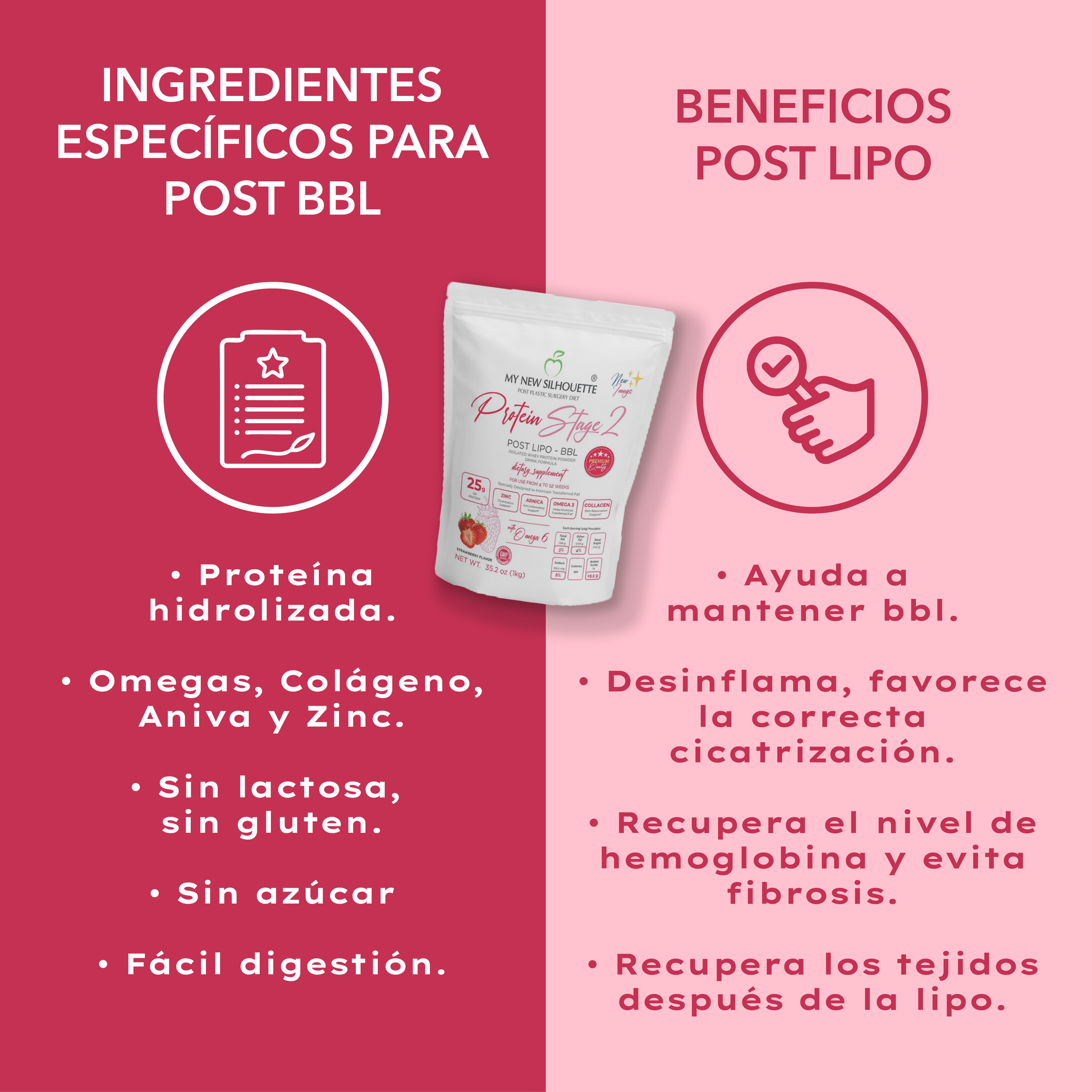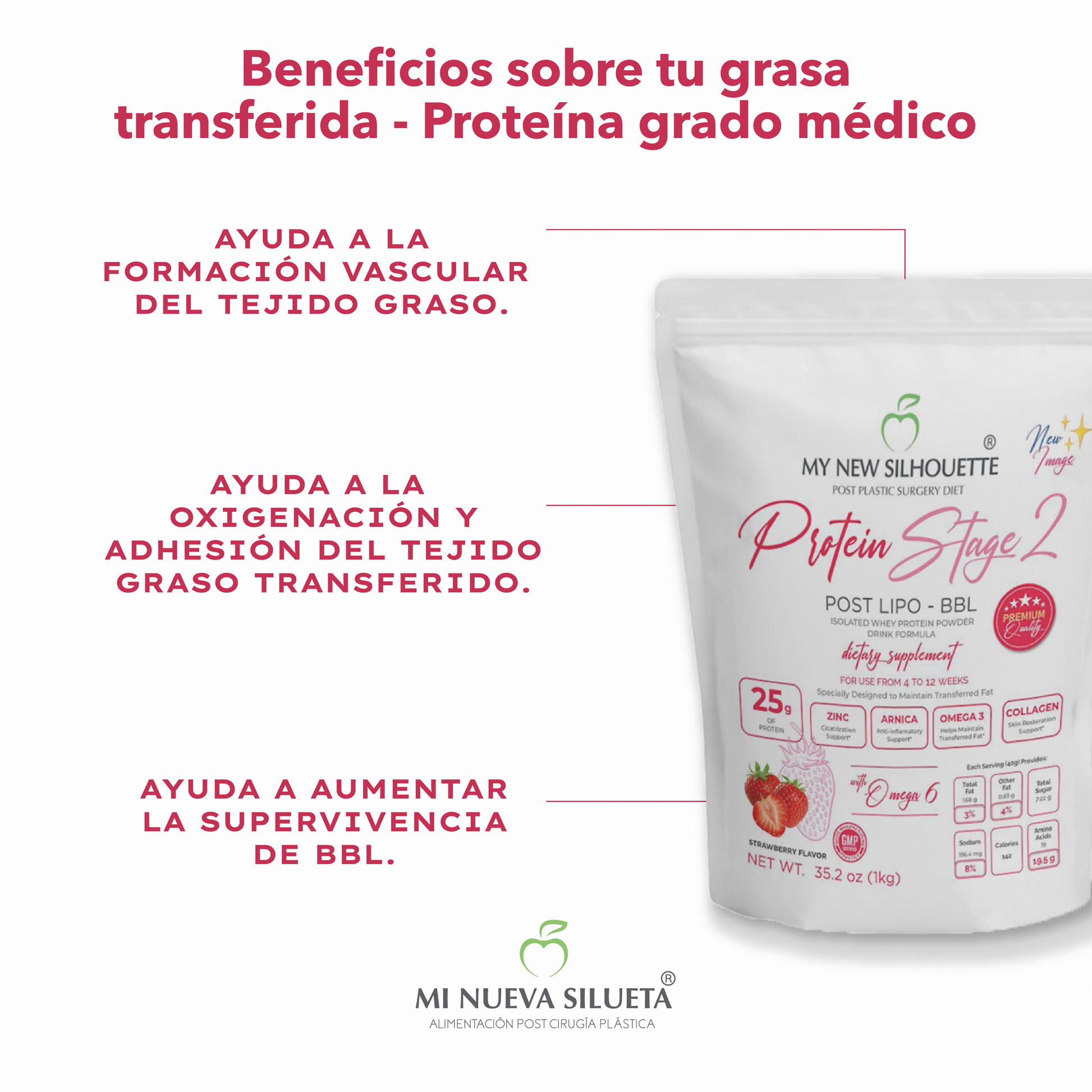 Proteína etapa 2: Una fórmula especializada para tu bienestar postquirúrgico MANTENIMIENTO DE GRASA: Ayuda a mantener la grasa transferida durante tu proceso de recuperación post liposucción. RECUPERACIÓN DE HEMOGLOBINA: Contribuye a recuperar los niveles de hemoglobina y promueve una salud óptima. EVITA FIBROSIS POST LIPO: Previene la aparición de fibrosis después de la liposucción, manteniendo resultados estéticos satisfactorios. CICATRIZACIÓN RÁPIDA: Promueve una cicatrización rápida y adecuada, reduciendo el tiempo de recuperación. REDUCE LA INFLAMACIÓN: Ayuda a desinflamar la zona tratada, disminuyendo la incomodidad postquirúrgica. FÁCIL DE USAR: Consume una toma al día. Agrega 2 scoops en 250 a 600 ml de agua o leche, mezcla en un procesador o shaker. ¡Puedes añadir frutas o cereales para personalizar tu bebida! COMPLEMENTO POST CIRUGÍA: No sustituye alimentos, es un extra que el cuerpo necesita durante la etapa de recuperación postquirúrgica.