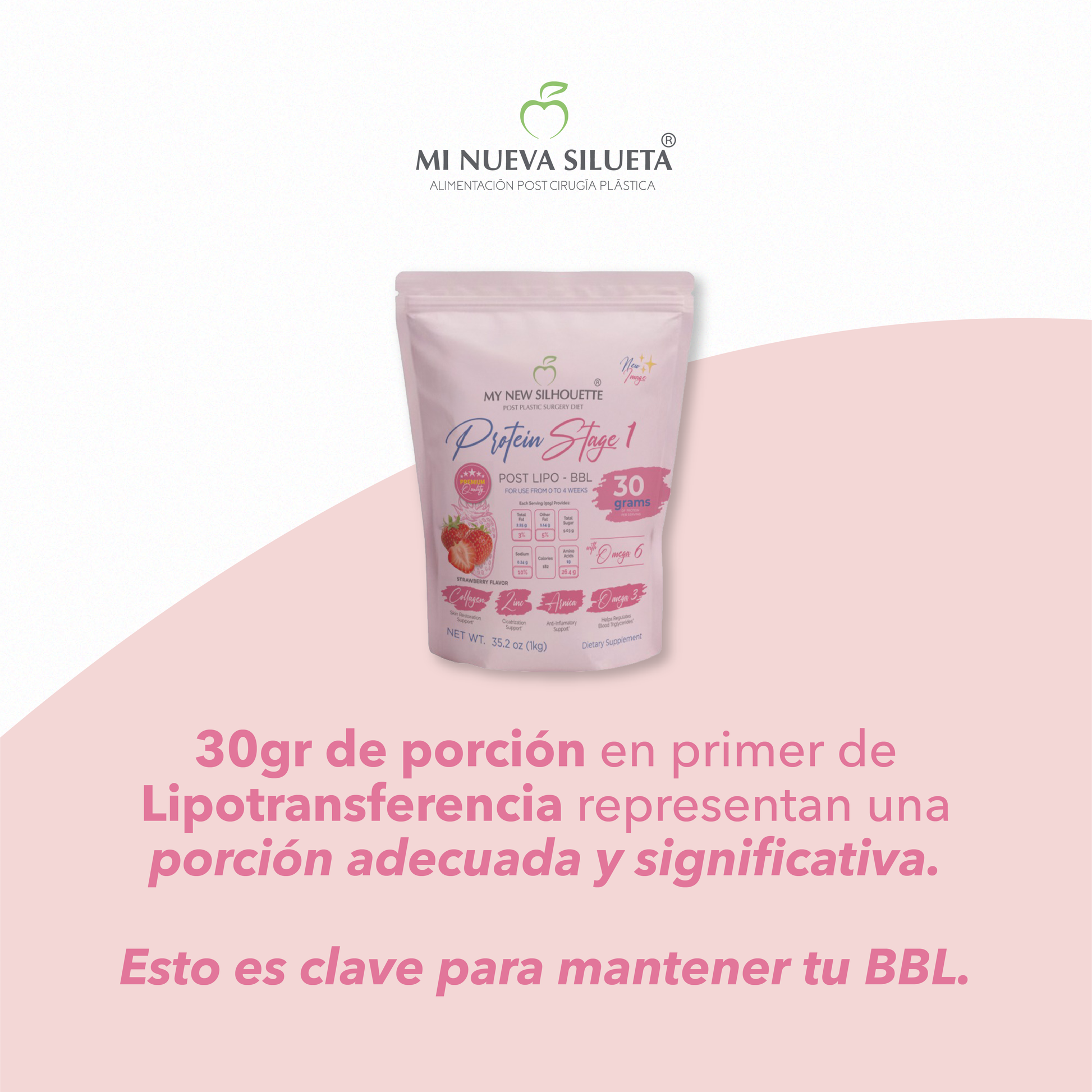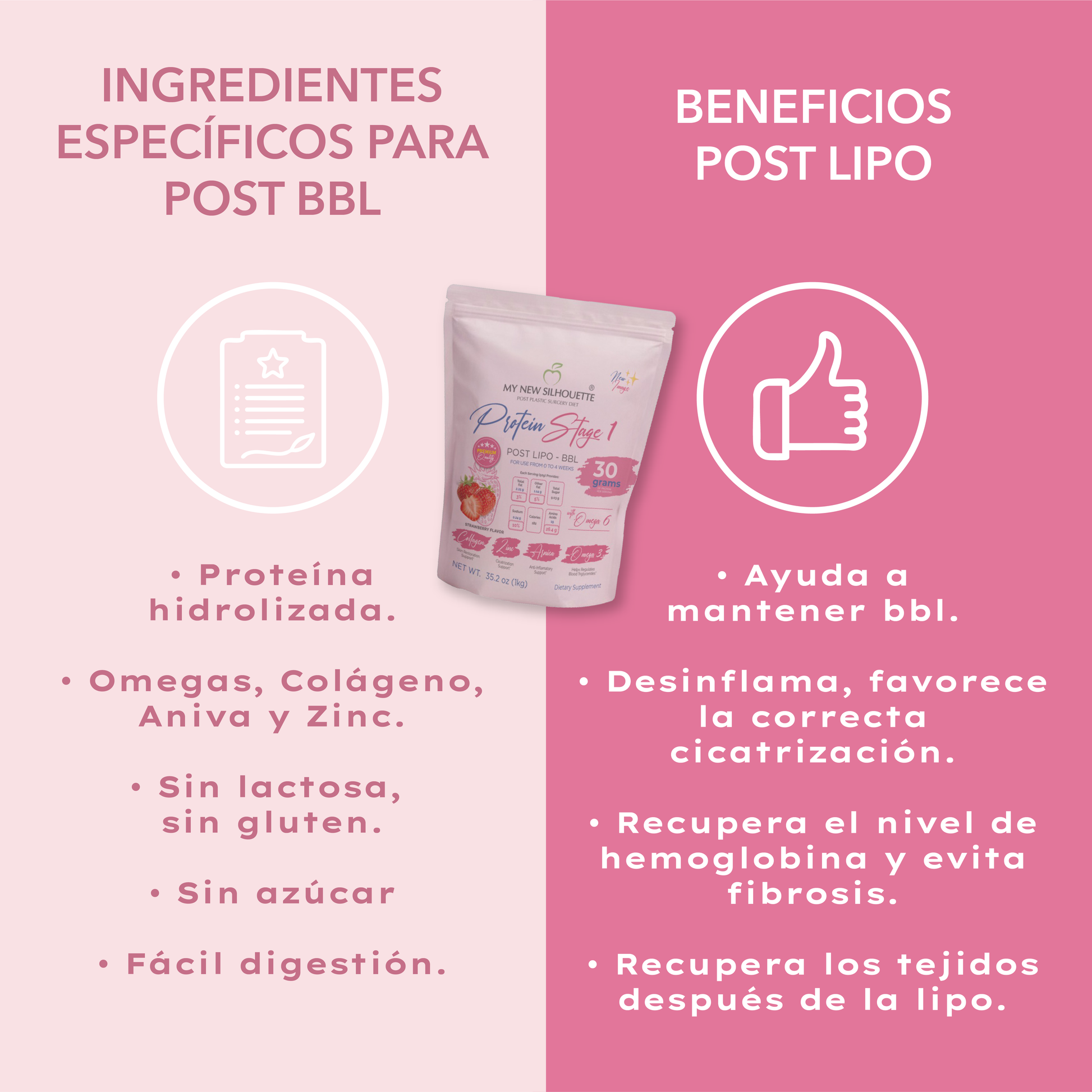 INGREDIENTS: • Isolated protein (30 g per serving) • Omega 3, 6 and 9 • Collagen • Iron • Zinc • lactose free BENEFITS: • Helps maintain transferred fat. • Helps reduce inflammation. • Helps avoid fibrosis. • Helps heal. • Helps recover hemoglobin levels. • Helps form vascularity around the transferred fat cells. • Helps repair damaged tissues after lipo.